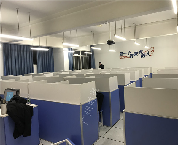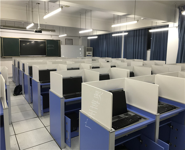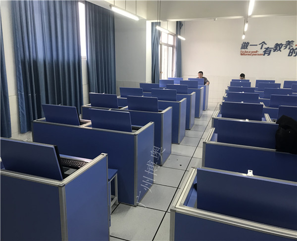 1、升降屏風(fēng)卡座左、中、右、前三邊帶升降擋板,升降板上沿高于側(cè)板350mm,用于阻隔相鄰考生視線。平時(shí)降下來(lái)可做普通計(jì)算機(jī)教室。