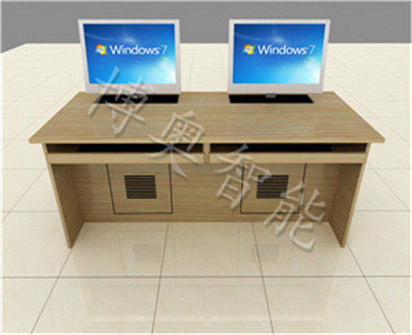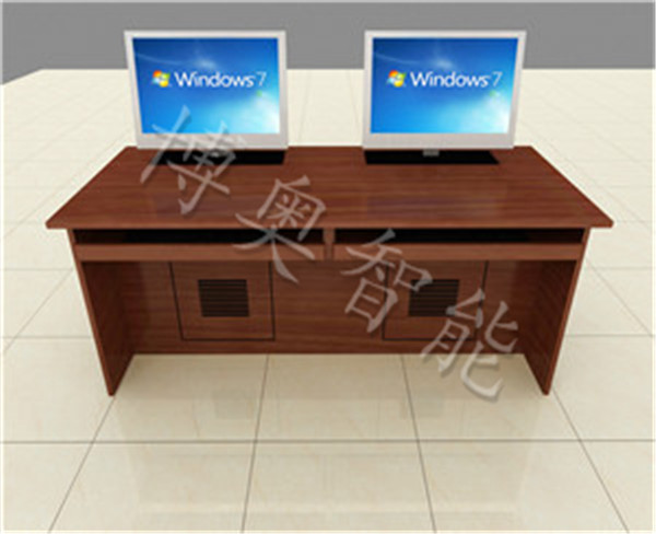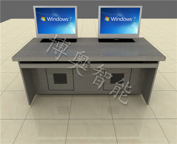 臺 身:采用16mm厚三聚氰胺雙面貼面板,其截面由PVC封邊帶利用日本進口機械高溫熱熔膠封邊,密封性好,外形美觀,經(jīng)久耐用結(jié) 構(gòu):每張桌子配置電動遙控液晶升降機(當時電腦時液晶顯示器自動重桌底升起且顯示器自動通電,當不使用顯示器時,顯示器自動隱藏于桌底),每一個位置都有一個電腦主機位,電腦桌前面設(shè)有檢修門,方便線路維修。