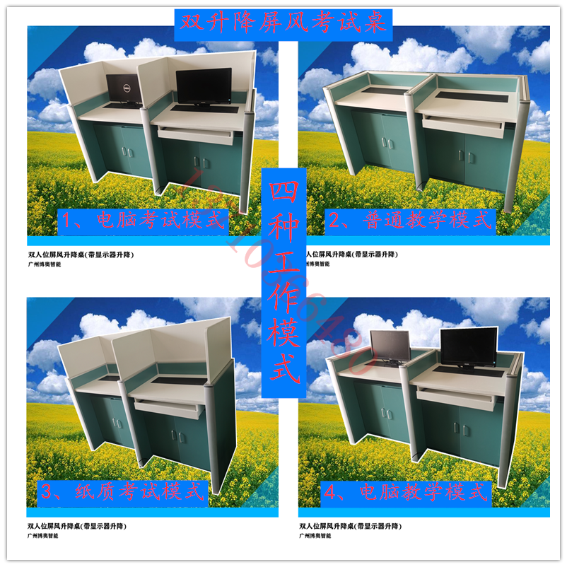 11、四種工作模式:(1)紙質(zhì)考試模式:屏風(fēng)升起,顯示器降下(帶顯示器升降)(2)電腦考試模式:屏風(fēng)升起,顯示器升起(帶顯示器升降)(3)電腦教學(xué)模式:屏風(fēng)降下,顯示器升起(帶顯示器升降)(4)常規(guī)教學(xué)模式:屏風(fēng)降下,顯示器升起(帶顯示器升降)