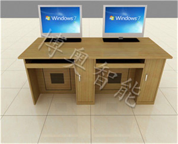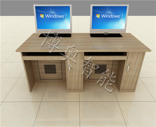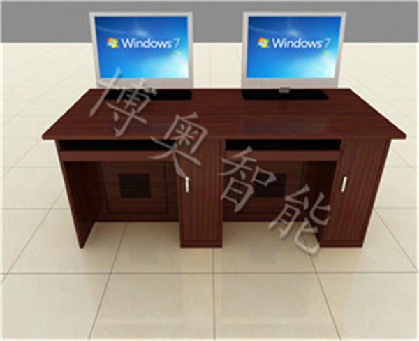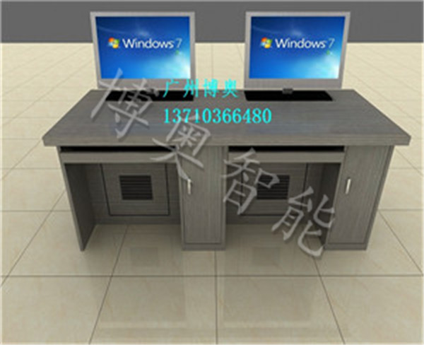 臺 身:采用16mm厚三聚氰胺雙面貼面板,其截面由PVC封邊帶利用日本進(jìn)口機(jī)械高溫?zé)崛勰z封邊,密封性好,外形美觀,經(jīng)久耐用結(jié) 構(gòu):每張桌子配置電動遙控液晶升降機(jī)(當(dāng)時電腦時液晶顯示器自動重桌底升起且顯示器自動通電,當(dāng)不使用顯示器時,顯示器自動隱藏于桌底),每一個位置都有一個電腦主機(jī)位,電腦桌前面設(shè)有檢修門,方便線路維修。