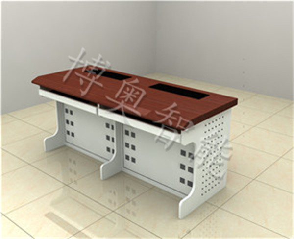 結(jié) 構(gòu):每張桌子配置電動遙控液晶升降機(當(dāng)時電腦時液晶顯示器自動重桌底升起且顯示器自動通電,當(dāng)不使用顯示器時,顯示器自動隱藏于桌底),每一個位置都有一個電腦主機位,電腦桌前面設(shè)有檢修門,方便線路維修。升降機參數(shù):